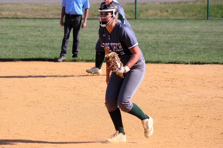 Cape May Tech pitcher Emma Oravits looks to throw to first base after fielding a ground ball.