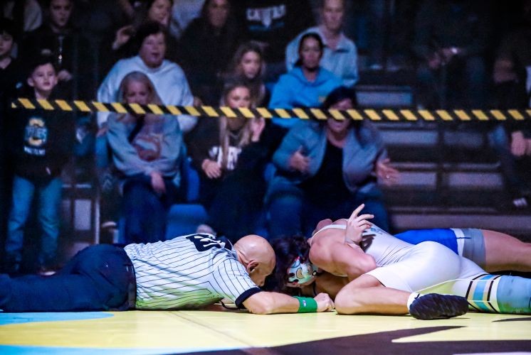 Ray’s second-period pin in the next bout at 175 pounds caused the crowd to erupt with euphoria as the result gave the Caper Tigers the lead for good. The efforts by Byrne and Ray were the start of five straight victories for Lower – the last four of which came via fall – and secured a 42-27 victory by the Caper Tigers that sends the program to the state championship match for the first time in program history.