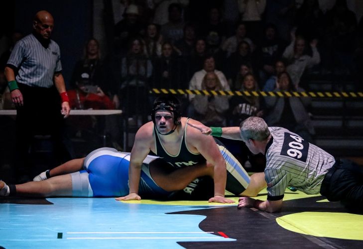 The match official begins dropping his hand to signal a pin for Lower Cape May's Jake Hearon in the 185-pound bout.